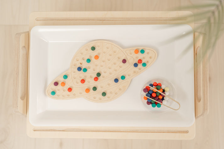 Follow a classic pattern, or let young minds express their creativity by exploring new designs. Place the balls in a container or bowl for easy ball access and use the bamboo tongs provided to give an extra challenge.