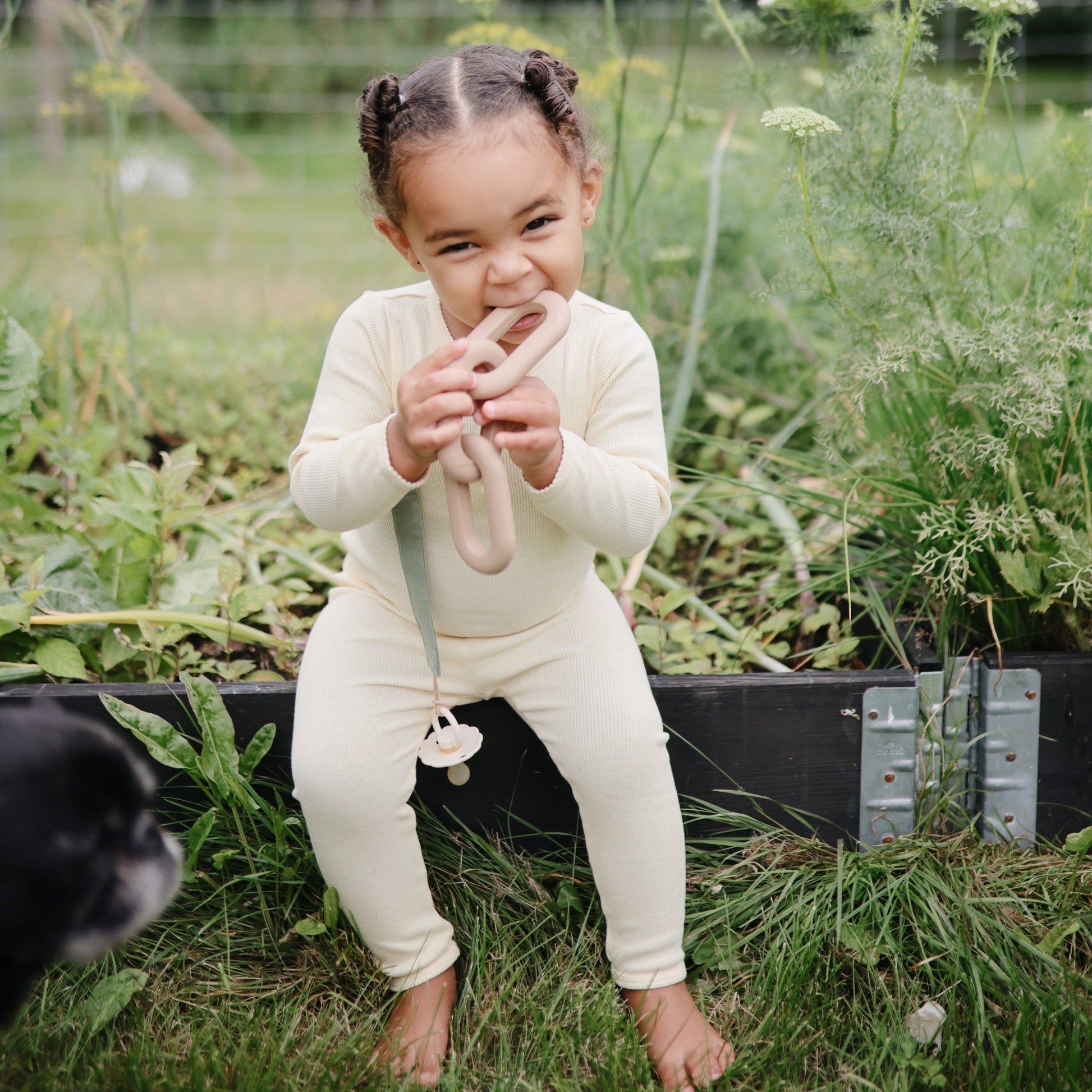 Offer comfort and relief with a teether designed to soothe sore gums throughout the entire teething journey. Made from 100% food-grade silicone, our teether is easily held by tiny hands. With three connecting links that mirror modern design aesthetics, parents can maintain their personal style while littles enjoy a practical and playful toy.