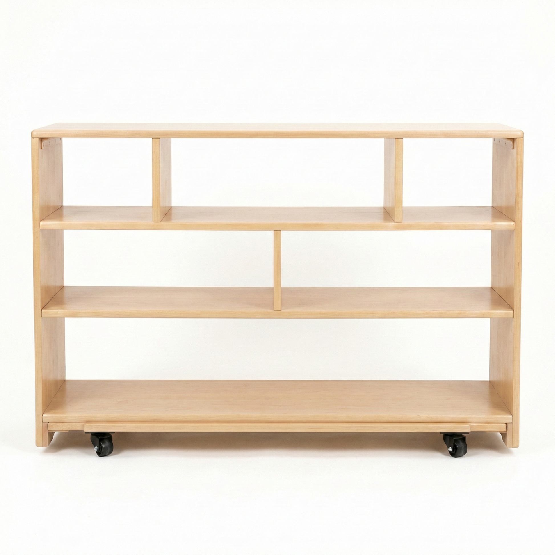 Three wide tiers and six roomy cubbies help keep books, toys, and supplies neatly organized and within easy reach for children. The natural wood finish complements modern learning environments, while the rounded edges and smooth surfaces offer a clean, child-friendly look. Whether placed in the center of the classroom or used to divide space, this shelf brings smart design to everyday use.