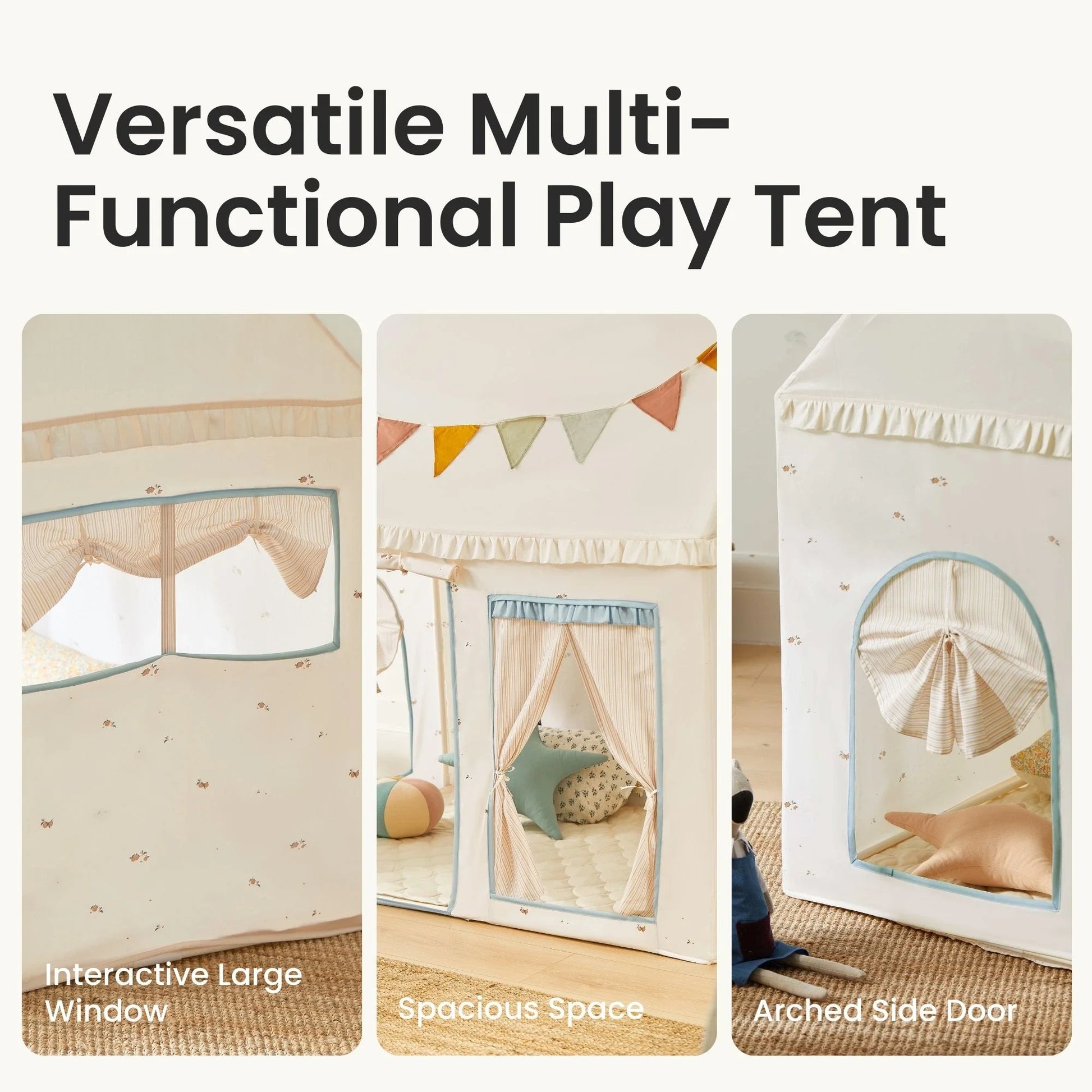 - Fun asymmetrical tent with roll-up door, side windows, and arched peek-a-boo door
